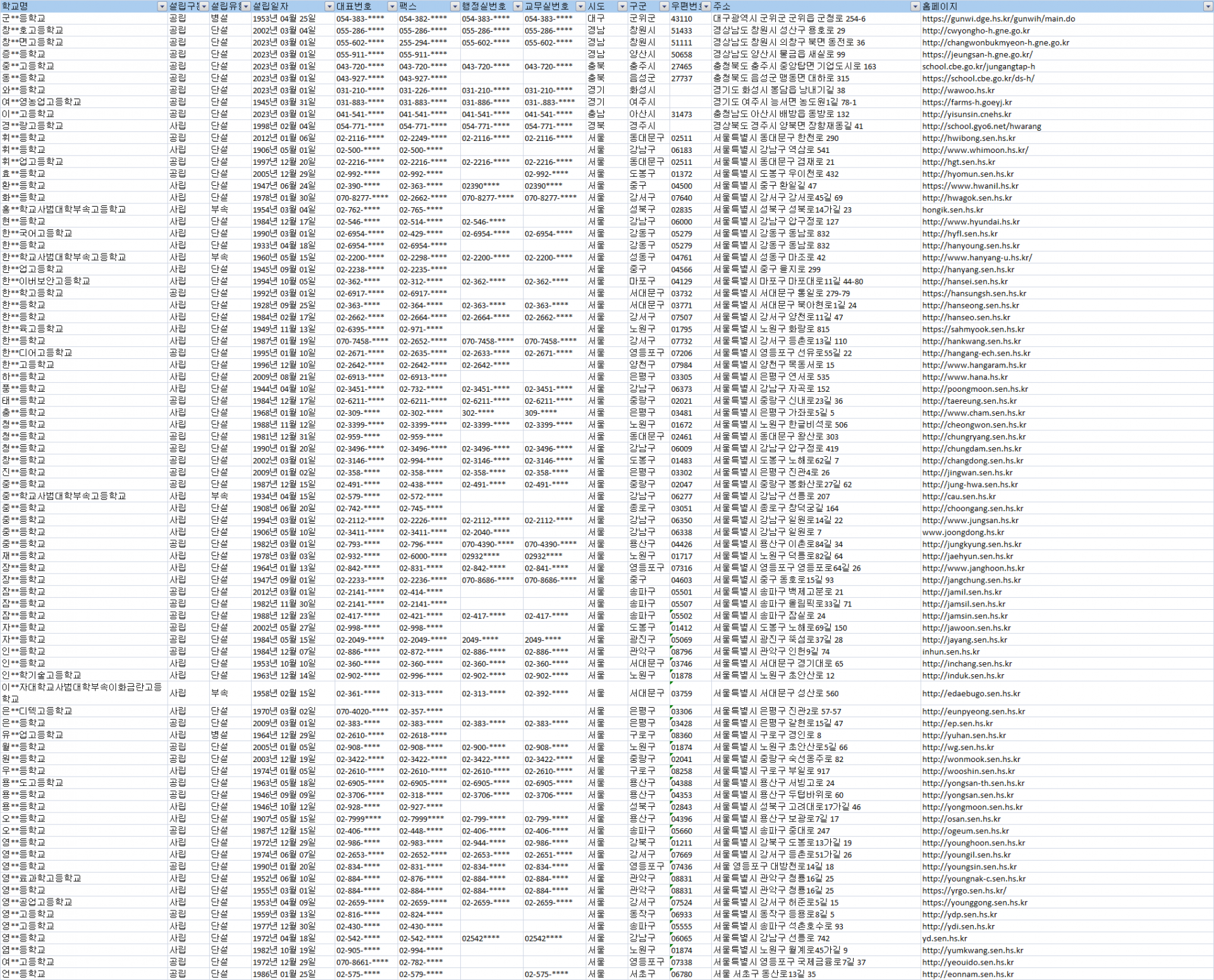 제공자료 : 학교명, 설립일자, 대표번호, 팩스번호, 행정실번호, 교무실번호, 시도, 구군, 우편번호, 주소, 홈페이지
