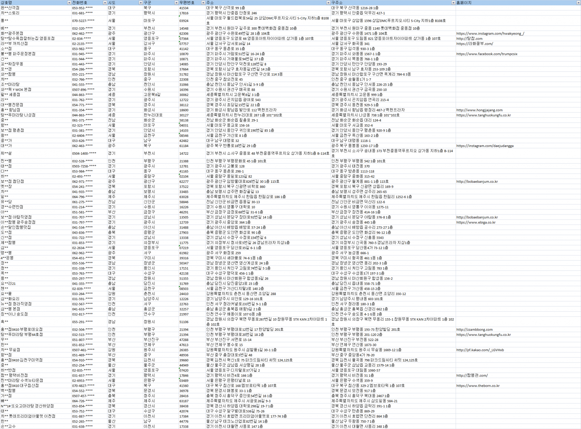 제공자료 : 상호명, 전화번호, 시도, 구군, 우편번호, 주소, 구주소, 홈페이지