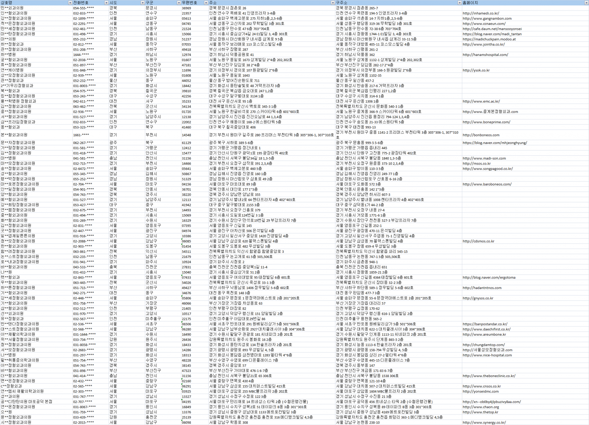 제공자료 : 상호명, 전화번호, 시도, 구군, 우편번호, 주소, 구주소, 홈페이지
