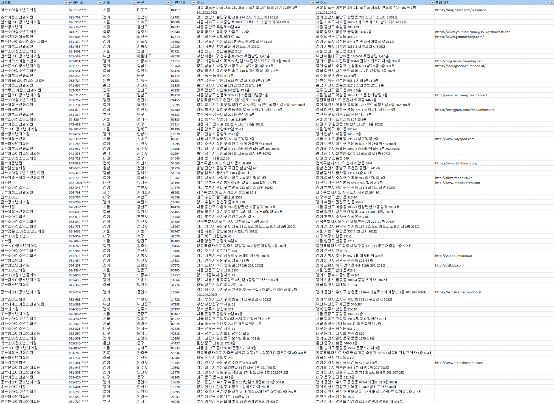 전국 소아청소년과 주소록