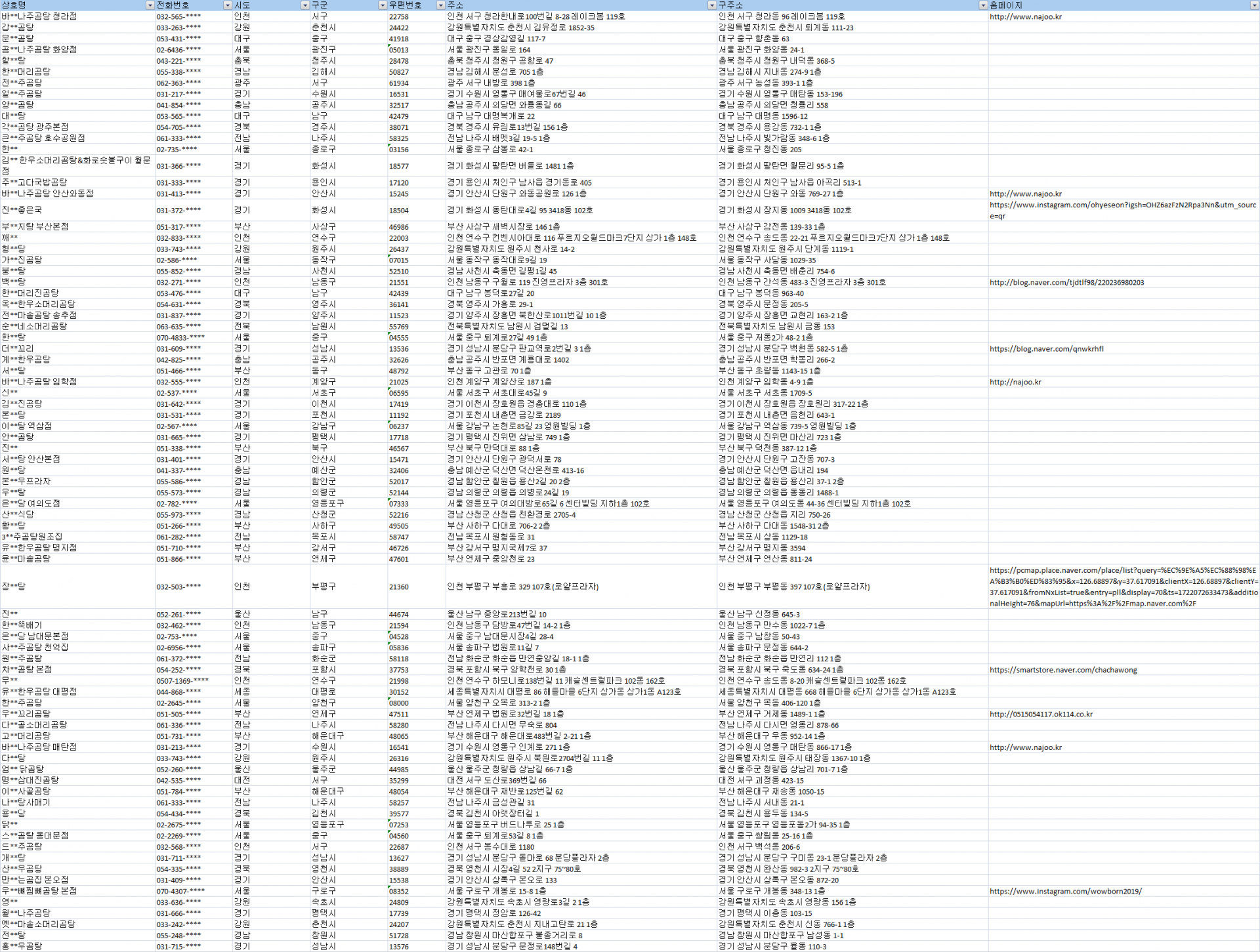 제공자료 : 상호명, 전화번호, 시도, 구군, 우편번호, 주소, 구주소, 홈페이지