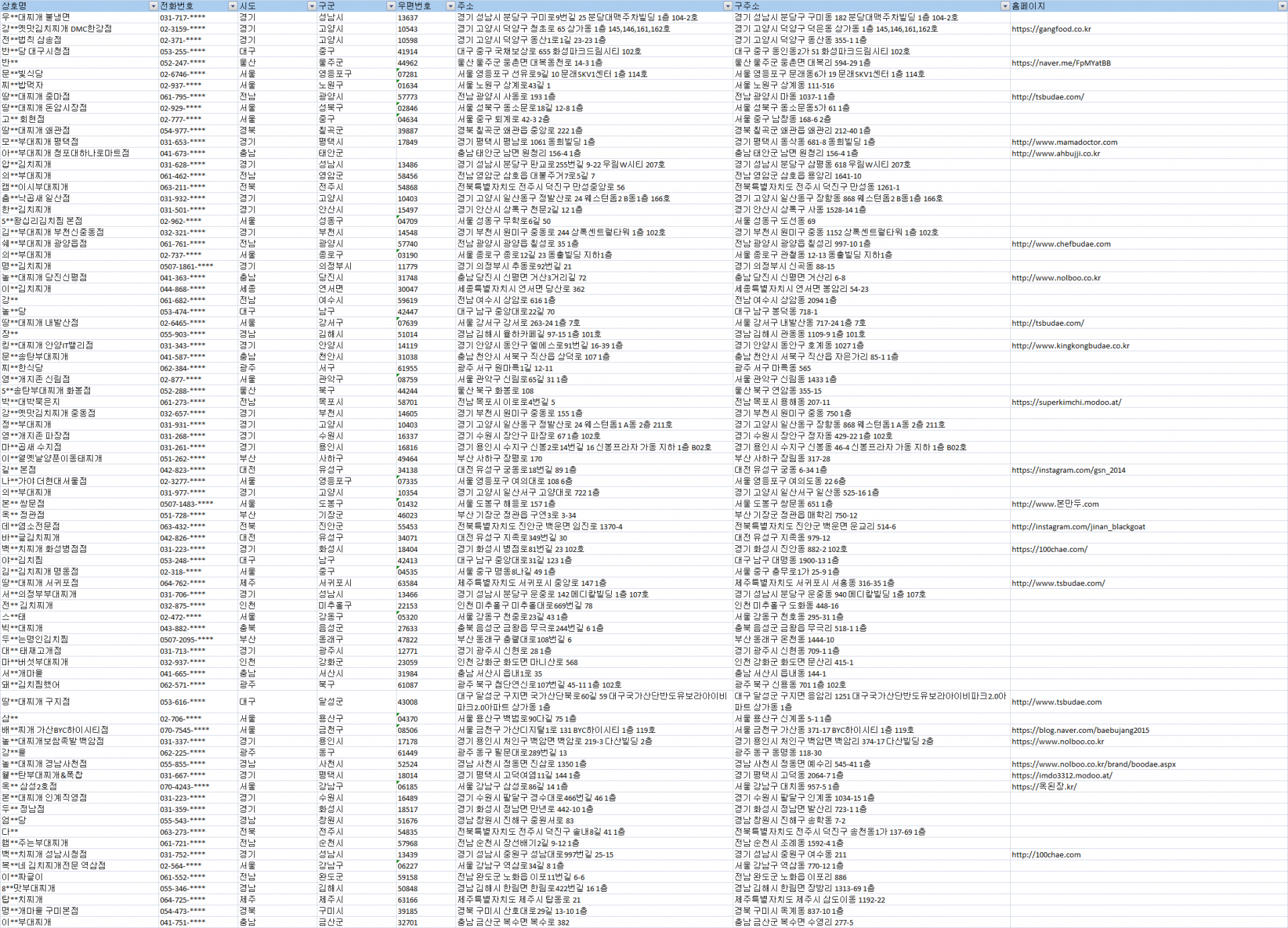 제공자료 : 상호명, 전화번호, 지역, 우편번호, 주소, 홈페이지