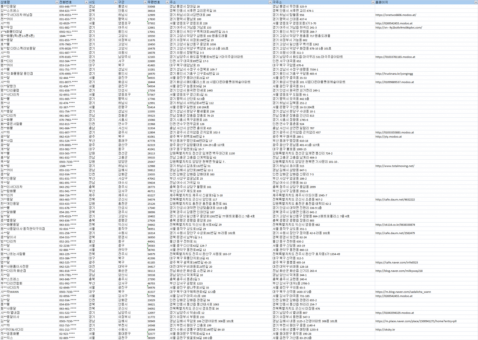 수집항목 : 상호, 전화번호, 시도, 구군, 우편번호, 주소, 구주소, 홈페이지