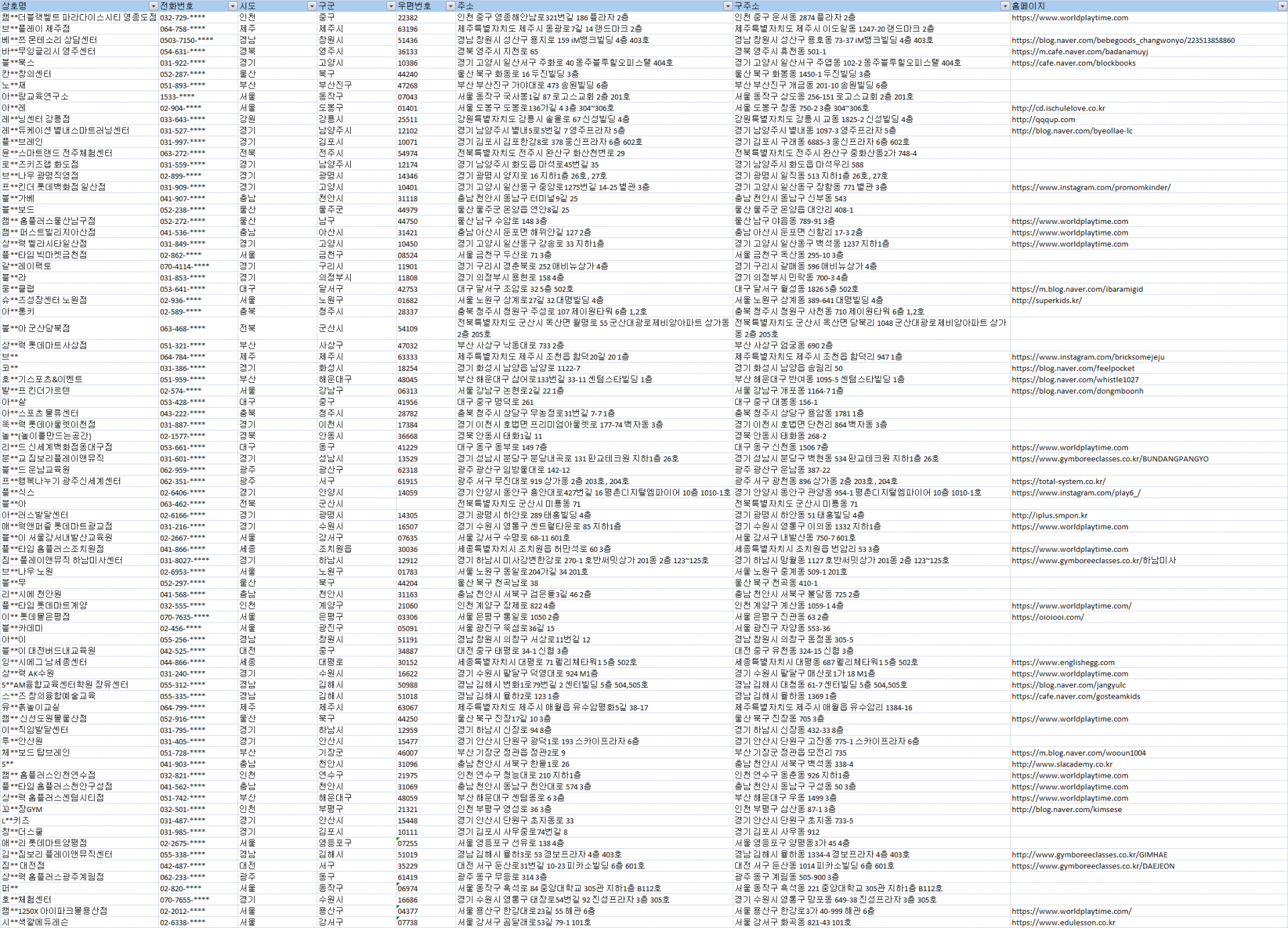 제공자료 : 상호명, 전화번호, 시도, 구군, 우편번호, 주소, 구주소, 홈페이지