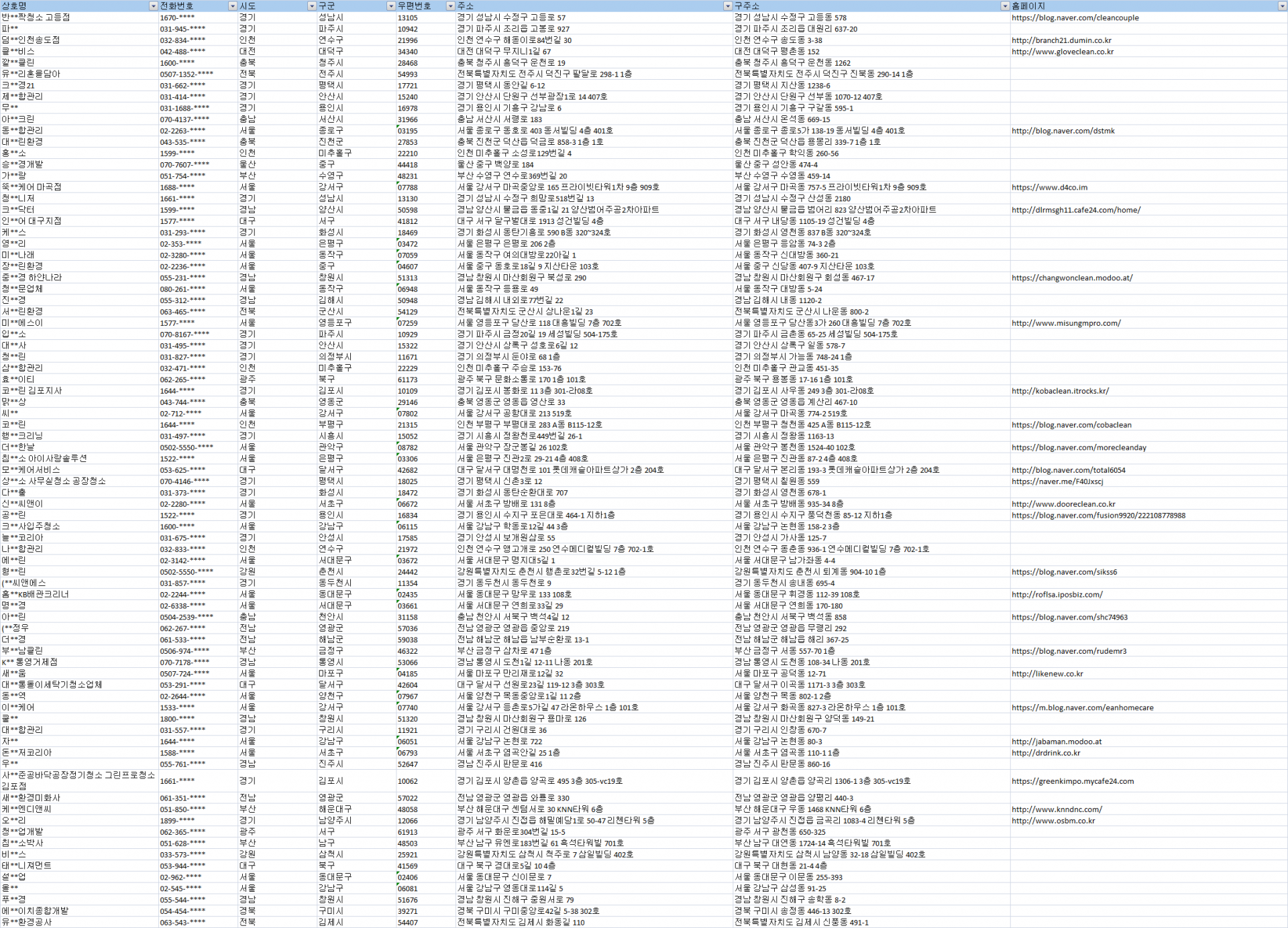 수집항목 : 상호, 전화번호, 시도, 구군, 우편번호, 주소, 구주소, 홈페이지