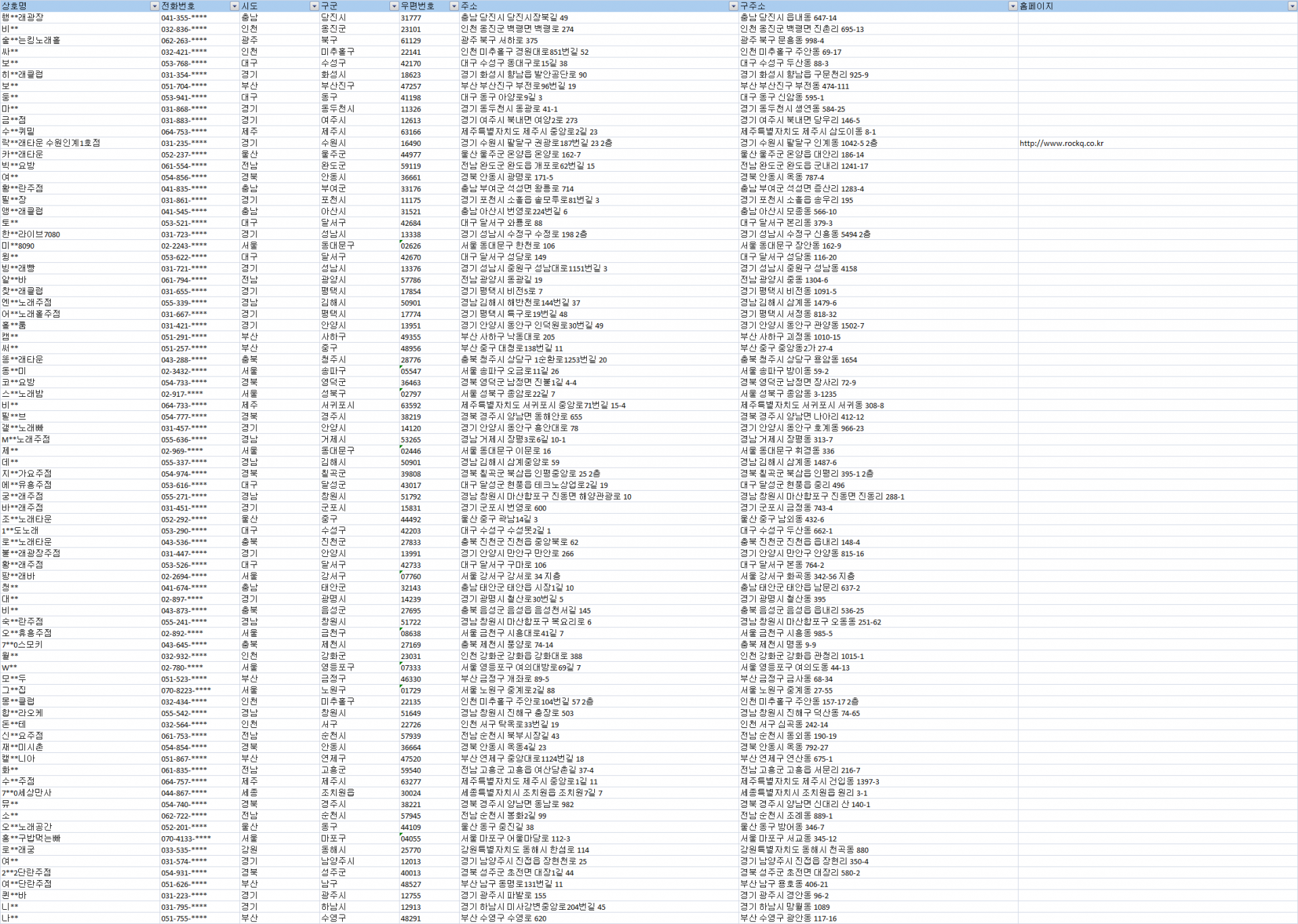 제공자료 : 상호명, 전화번호, 시도, 구군, 우편번호, 주소, 구주소, 홈페이지