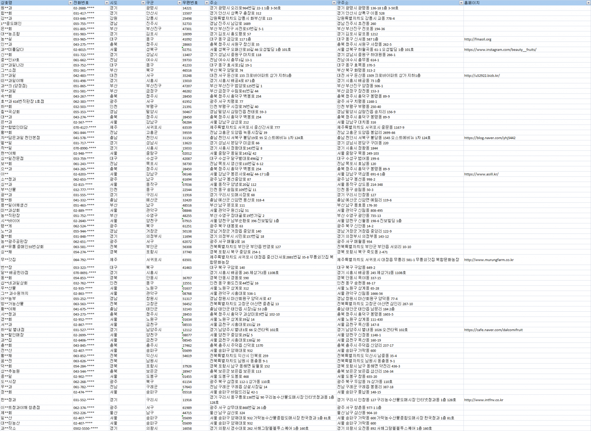 제공자료 : 상호명, 전화번호, 시도, 구군, 우편번호, 주소, 구주소, 홈페이지