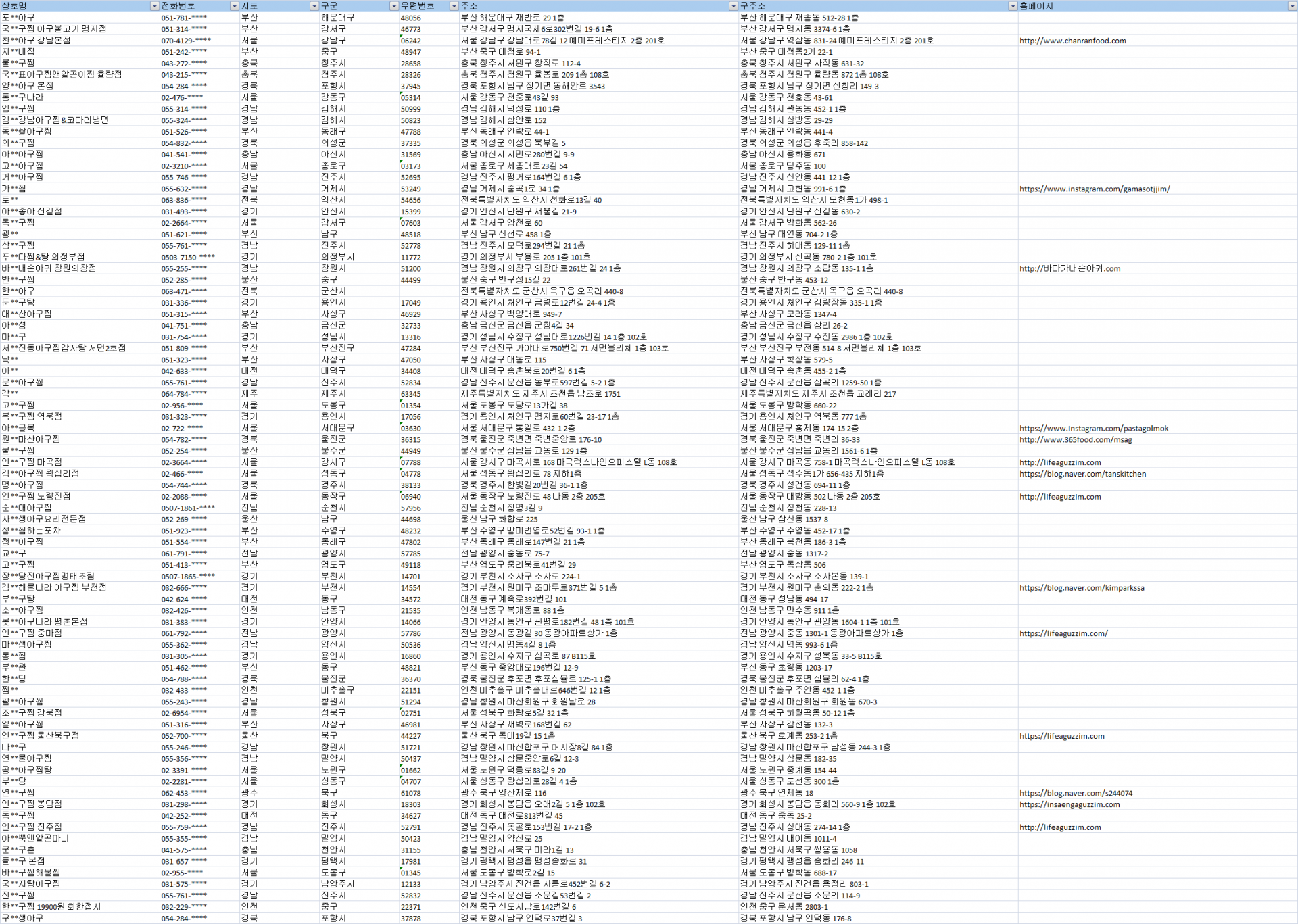 제공자료 : 상호명, 전화번호, 시도, 구군, 우편번호, 주소, 구주소, 홈페이지