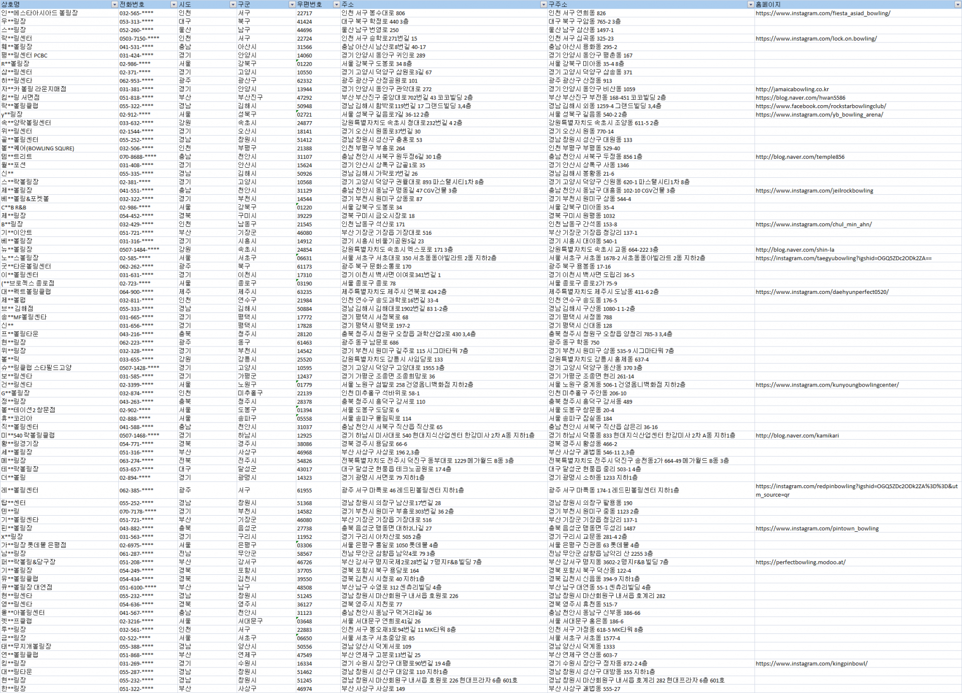 #볼링장주소록 #볼링장디비 #볼링장DB #전국볼링장리스트 #전국볼링장 #볼링장연락처 #볼링장전화번호 #볼링장목록