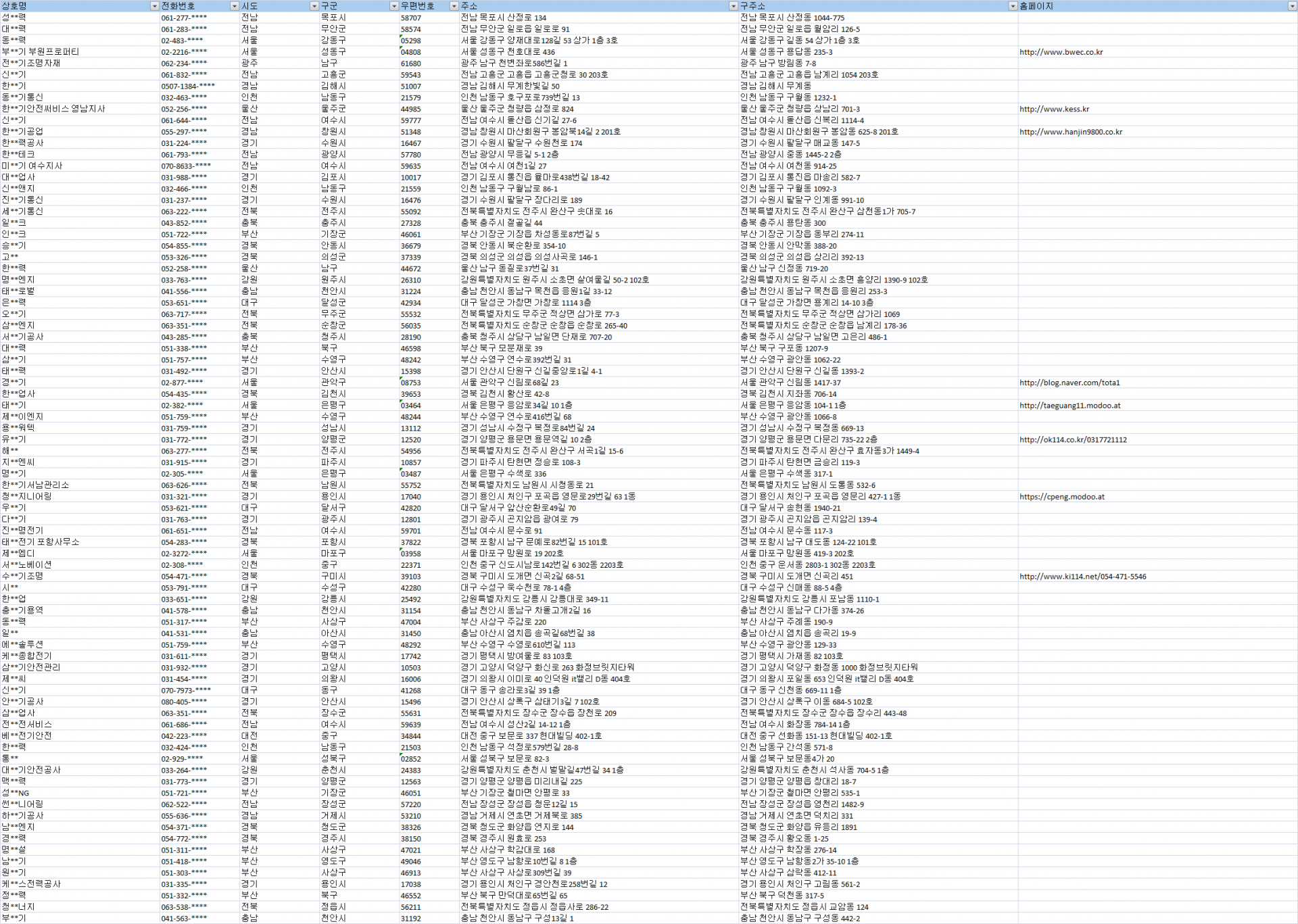 제공자료 : 상호명, 전화번호, 시도, 구군, 우편번호, 주소, 구주소, 홈페이지