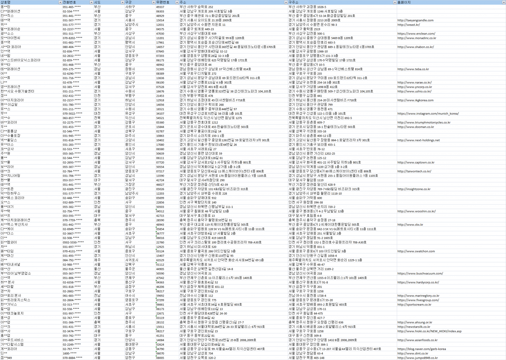 제공자료 : 상호명, 전화번호, 시도, 구군, 우편번호, 주소, 구주소, 홈페이지