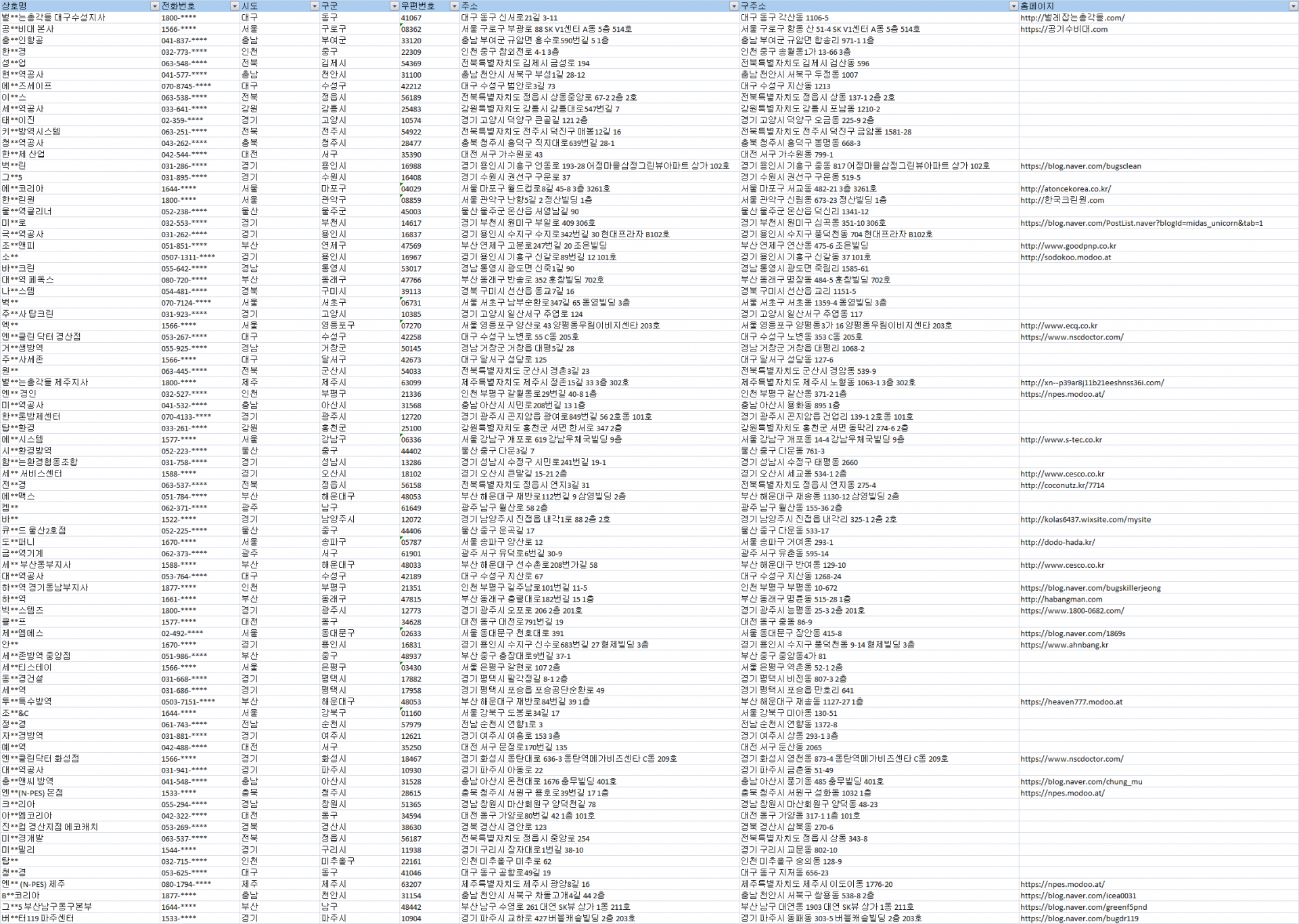 수집항목 : 상호, 전화번호, 시도, 구군, 우편번호, 주소, 구주소, 홈페이지