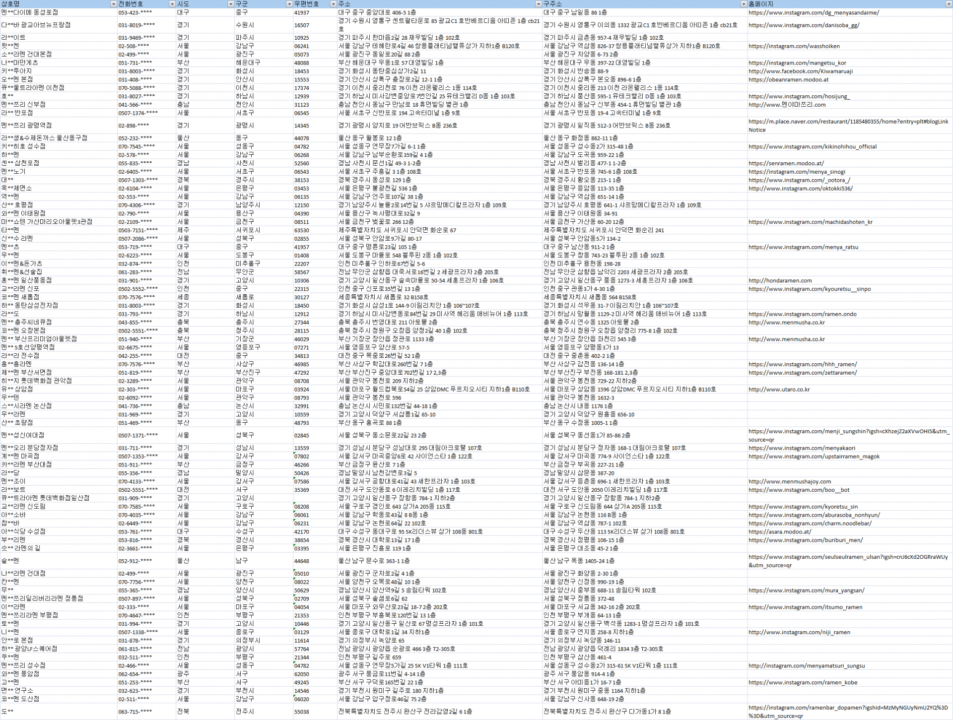 전국 일본식라면 음식점 주소록