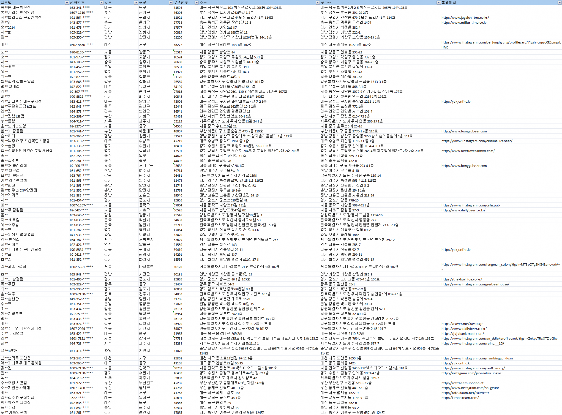 제공자료 : 상호명, 전화번호, 시도, 구군, 우편번호, 주소, 구주소, 홈페이지