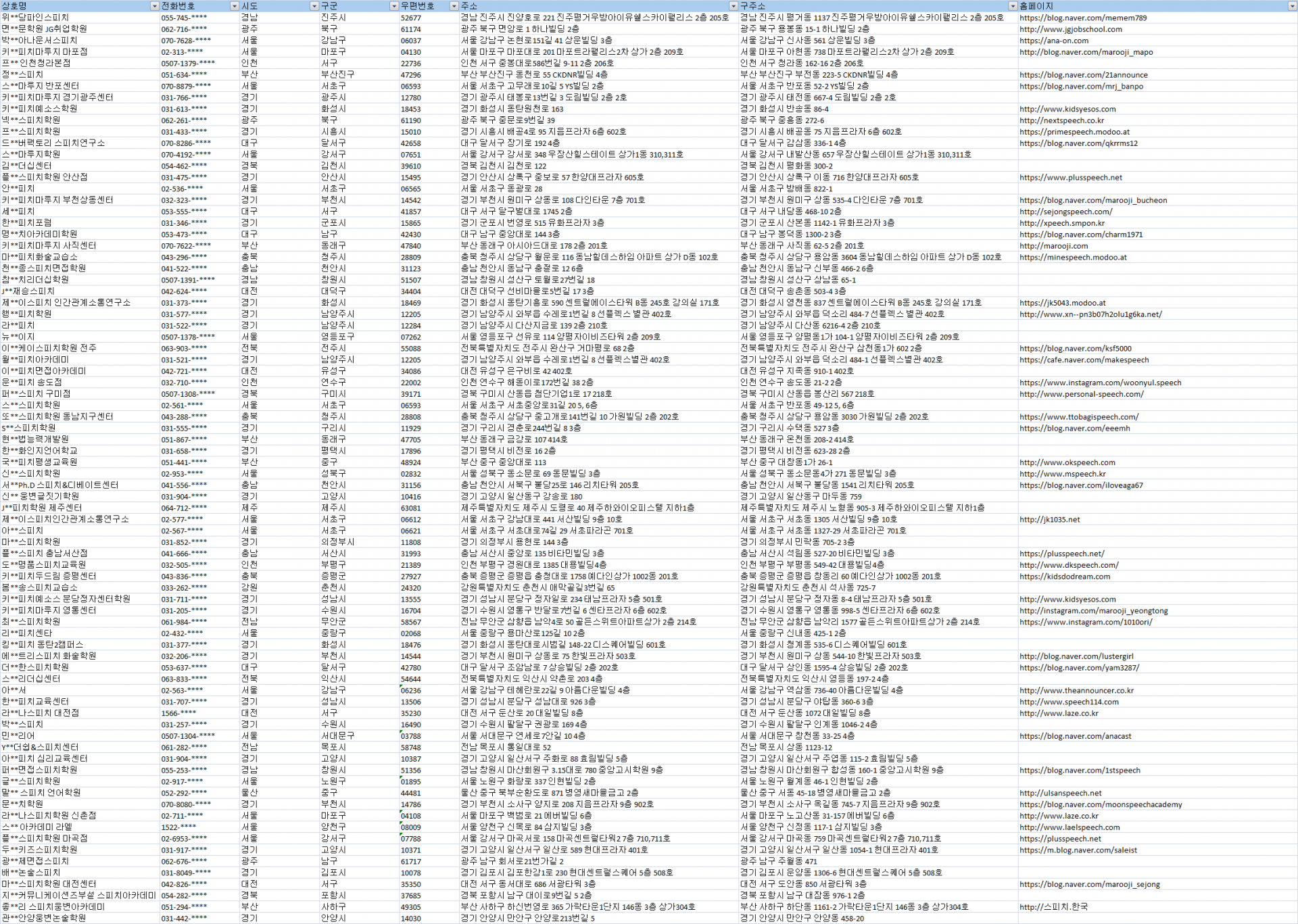 제공자료 : 상호명, 전화번호, 시도, 구군, 우편번호, 주소, 구주소, 홈페이지