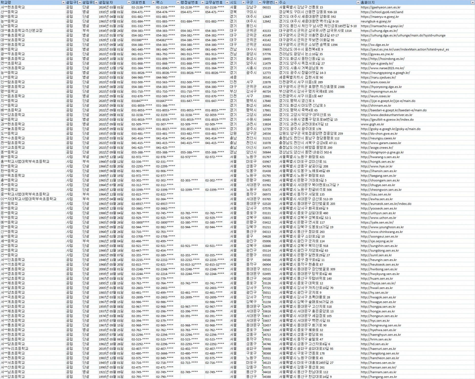 제공자료 : 학교명, 설립일자, 대표번호, 팩스번호, 행정실번호, 교무실번호, 시도, 구군, 우편번호, 주소, 홈페이지