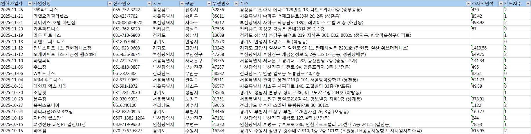 제공자료 : 인허가일자, 사업장명, 전화번호, 시도, 구군, 우편번호, 주소, 소재지면적, 지도자수