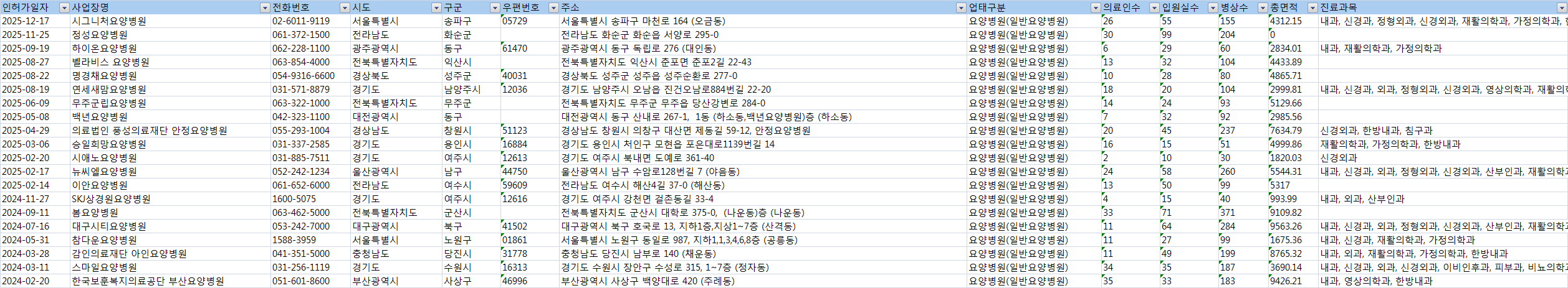 제공자료 : 인허가일자, 사업장명, 전화번호, 시도, 구군, 우편번호, 주소, 업태구분, 의료인수, 입원실수, 병상수, 총면적, 진료과목