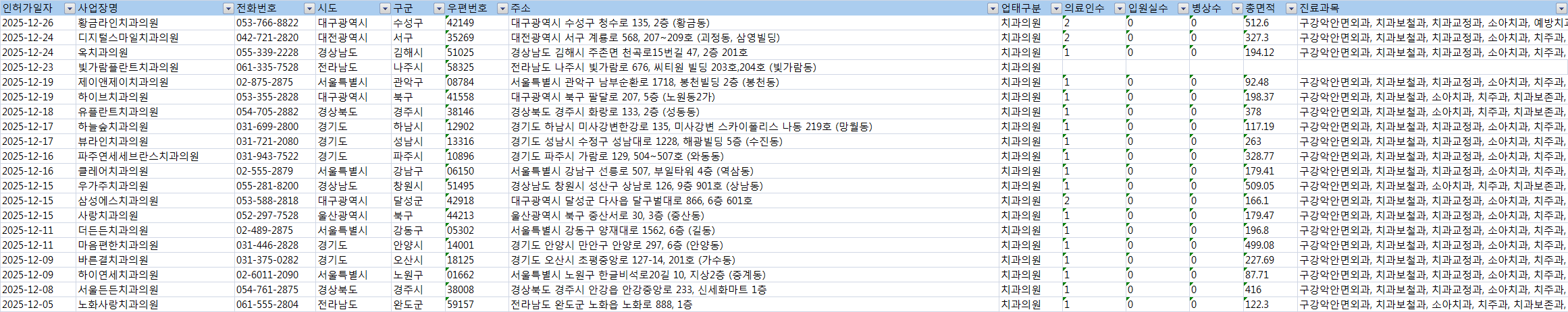 해당 일자 기준 영업중인 전국 치과 현황 정보입니다.